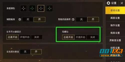 在刺激战场中陀螺仪的设定方法有三种:一直开启、开镜开启及其关掉;