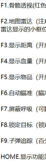 自瞄F6+F7请低调使用,建议在决赛圈人少的时候使用,同一个方向人多的时候不建议使用,近战瞄准不需要开F7,F1-F5透视功能怎么杀都百分百不会有问题。